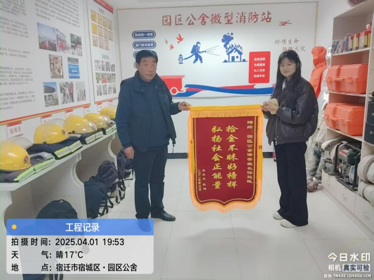 4月1日晚,園區(qū)公舍住宿員工為保安班長(zhǎng)任益臣送來一面錦旗,對(duì)他的拾金不昧表示感謝。