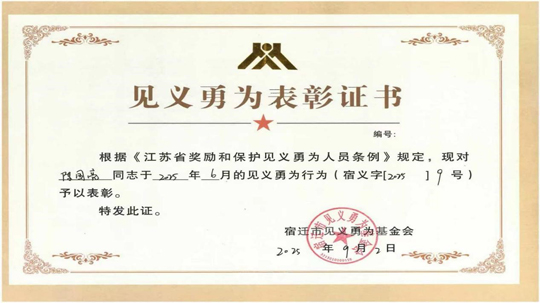 近日,園區(qū)蘇州公園工作人員陳國(guó)亮榮獲宿遷市見義勇為基金會(huì)“見義勇為”表彰。