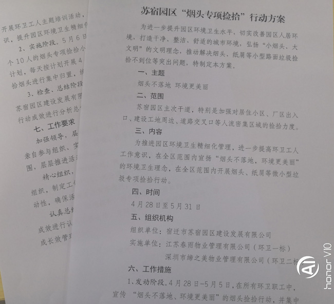 為了確?!盁燁^專項撿拾”行動順利開展,公司結(jié)合園區(qū)實際,精心籌劃,制定了《蘇宿園區(qū)“煙頭專項撿拾”行動方案》。